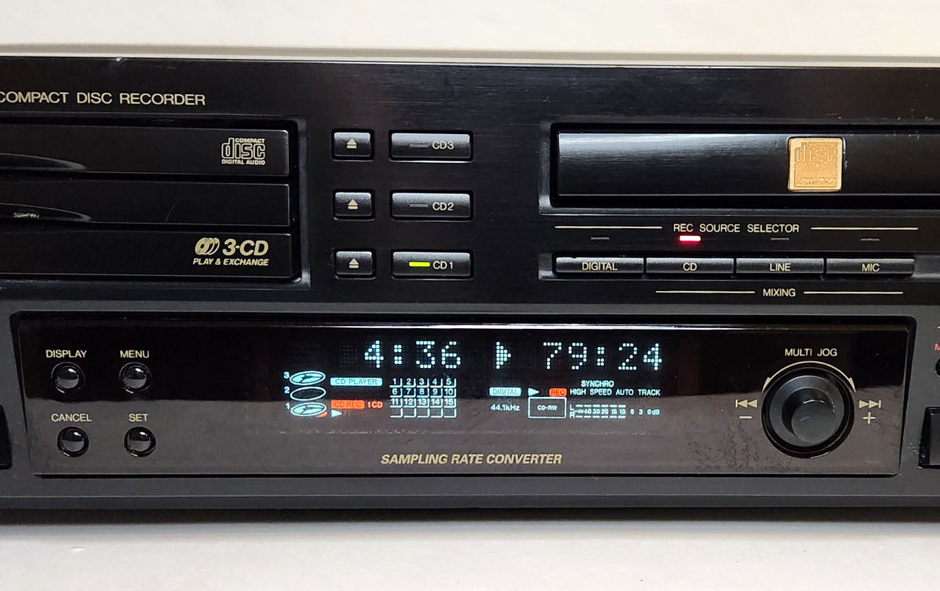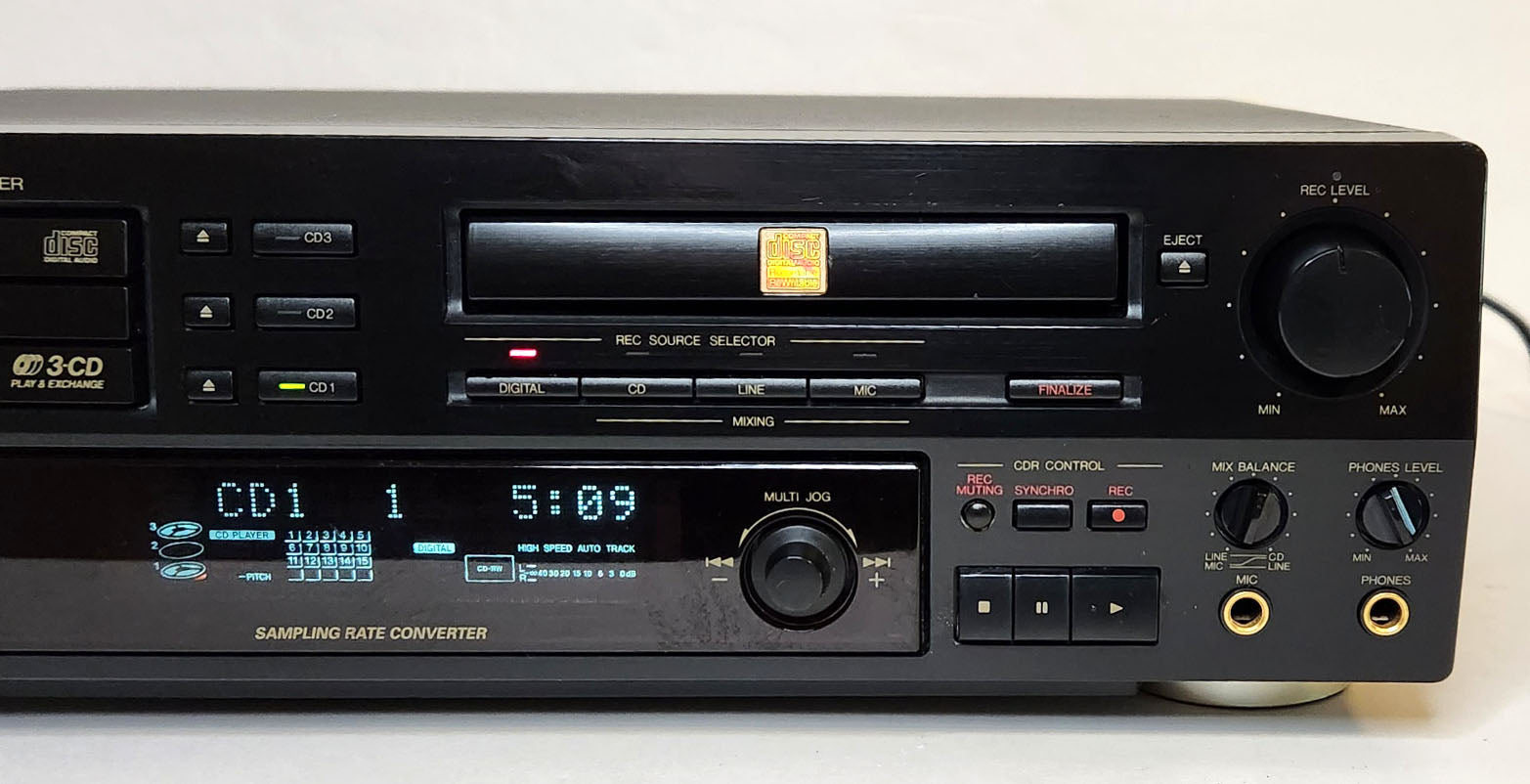 One-touch track/disc recording and high-speed (2X) whole-disc dubbing from the 3-CD changer on the left side to the CD-R/W recorder on the right.